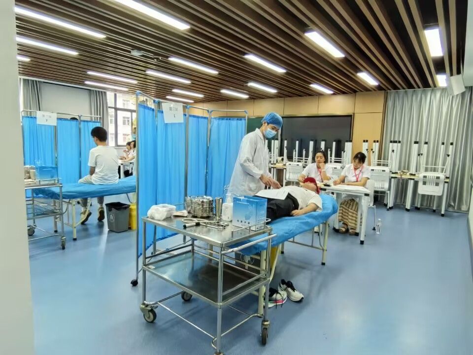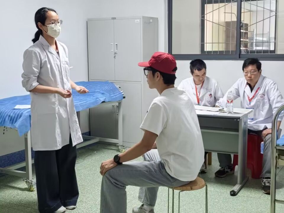 考生陆续进入考试环节后,全体志愿者同步进入工作状态。引导志愿者驻守各通道节点,为考生提供清晰路线指引;机动志愿者驻守考场区域,全程监测考试动态,保持应急响应状态;标准化病人(SP)的体格志愿者严格按照考核要求模拟真实诊疗场景,精准配合考生完成体格检查等操作。考试过程中,志愿者全程协助考生完成测试环节,与考务人员配合紧密,各流程衔接高效,有力保障了考场整体运行秩序。