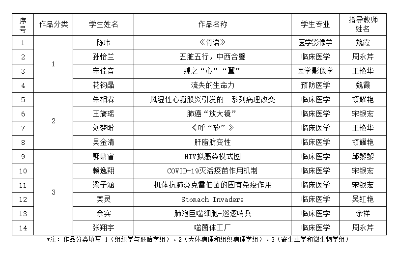 本次活动分三个组:《组织学与胚胎学》组、《病理学》组(含大体病理和组织病理)、《寄生虫学与微生物学》组三类,三峡大学医学院共收到参赛作品25项,经过院校专家组遴选,最终推荐14项作品参加全国总评,现公示如下: