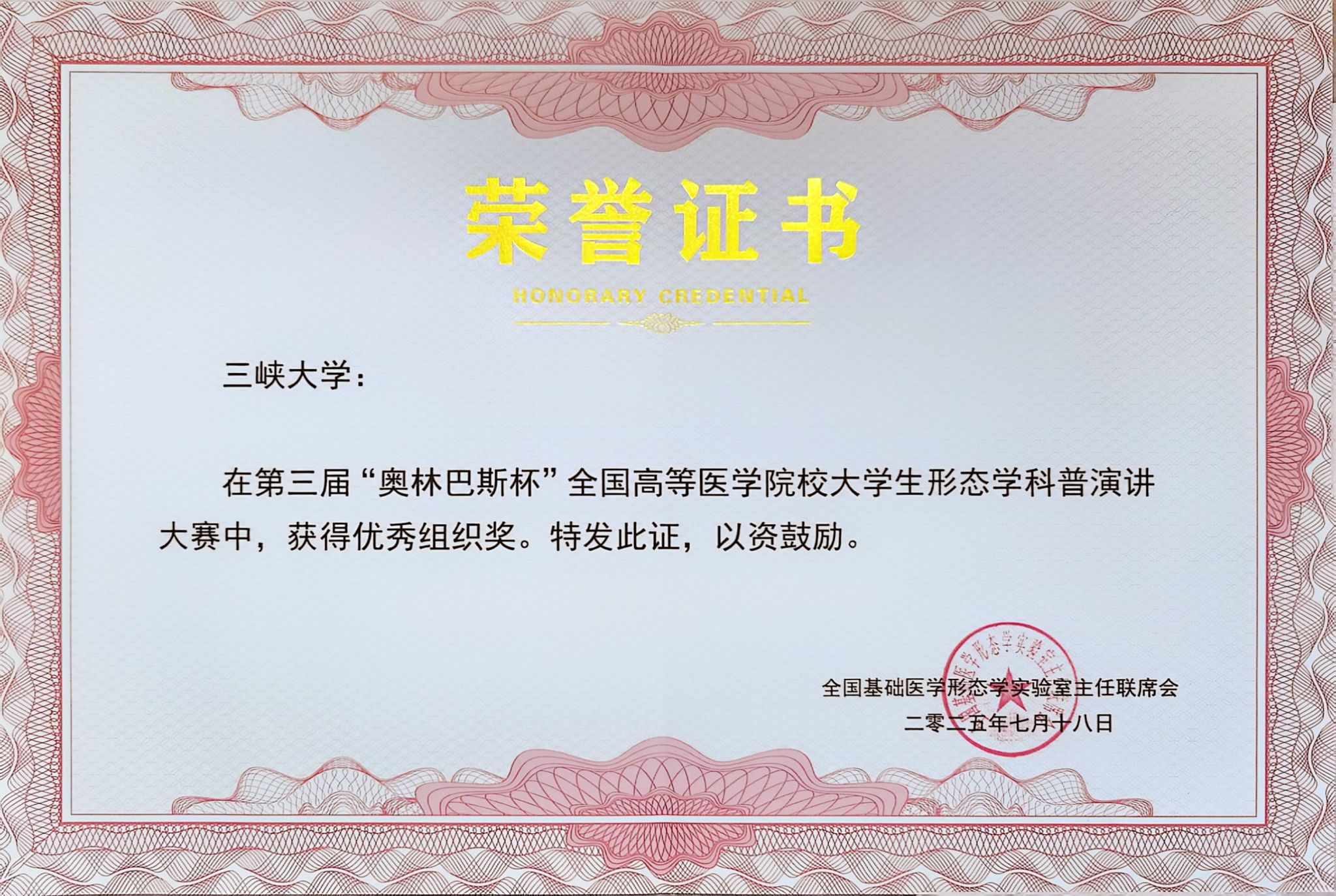 作为全国医学形态学领域的重要赛事,第三届“奥林巴斯杯”科普演讲大赛吸引了来自全国近50所高校的三百余支精英队伍同台竞技。经过多轮激烈角逐,我校共2项作品入围现场决赛并全部获奖。其中,付彦怡团队的作品《“梅”有证据,“毒”留案底》以生动形象的语言解读专业知识,搭配严谨的科学逻辑架构,荣获大赛一等奖;罗雨等同学创作的《千年宿敌:与恶性疟的生死对决》以及粟钰函等同学完成的《螺旋舞者:幽门螺杆菌的胃部传奇》,分别夺得二、三等奖,三峡大学获得“优秀组织奖”。