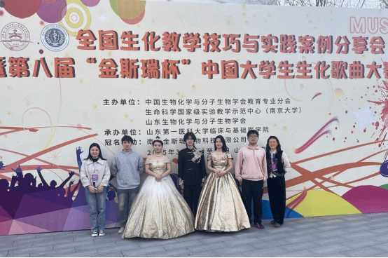 本届大赛竞争白热化,73支队伍以破圈创意颠覆传统科普:武术招式模拟酶促反应张力、歌剧咏叹调演绎DNA复制精密、方言说唱速记三羧酸循环……我校团队从校内选拔中突围后,历经数月精心打磨,对歌词科学性、舞台感染力精益求精,最终以清晰的生化逻辑、创新的独特编曲及默契演绎脱颖而出,在“生化音乐盛宴”中彰显我校学子实力。