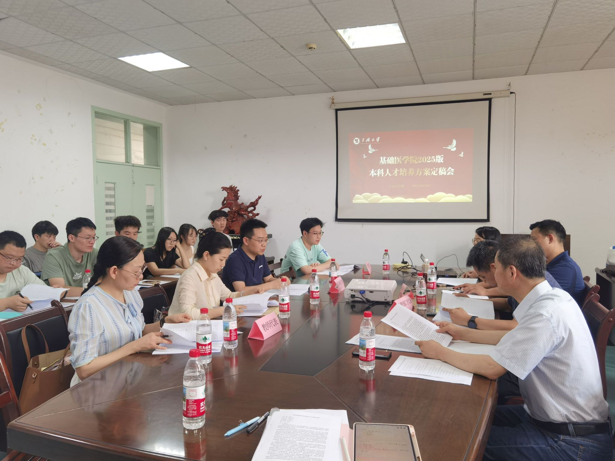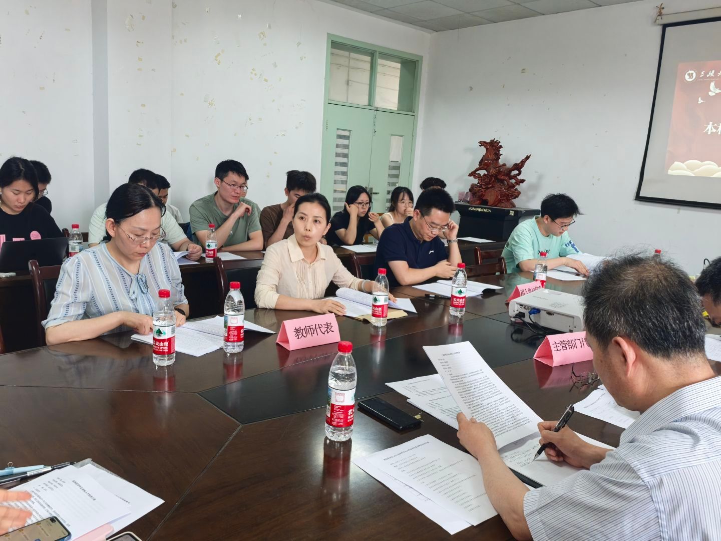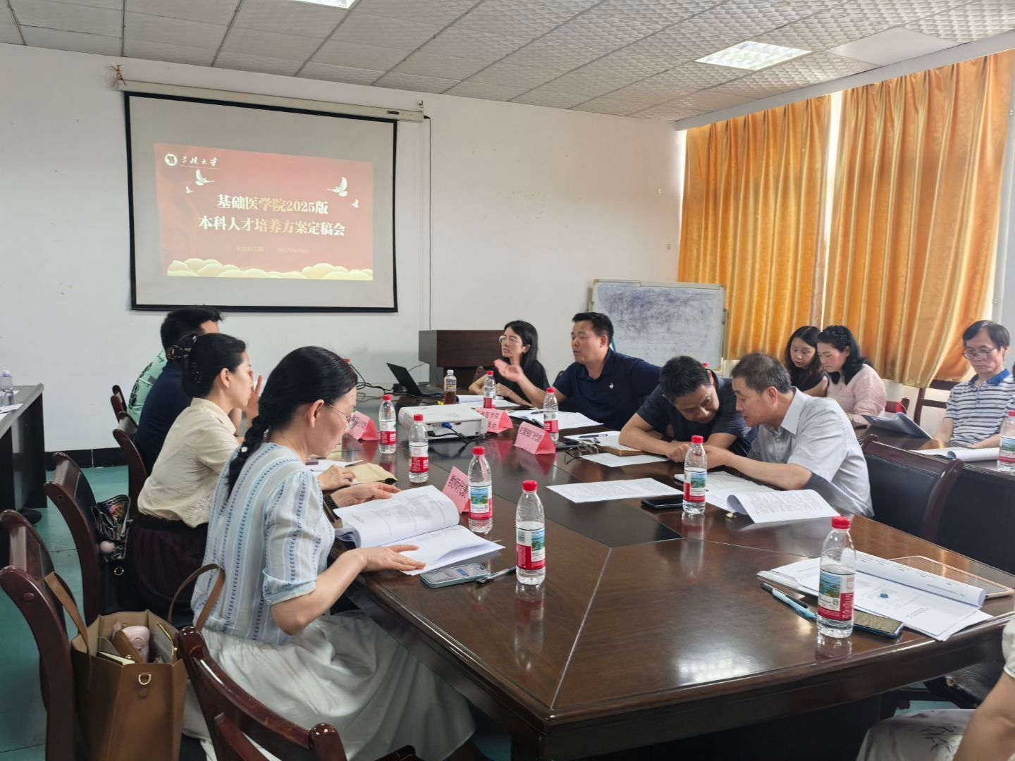 2025 年 6 月 6 日 15:00,三峡大学基础医学院在生命科学楼 S2-7 楼会议室召开 2025 版本科人才培养方案定稿会。基础医学院教学副院长张世忠主持会议,宜昌市卫生健康委员会副主任袁晋华、基础医学院党委副书记(主持工作)彭骥、学院教学指导委员会委员、用人单位代表、教师代表、学生代表等共计 30 余人参会。