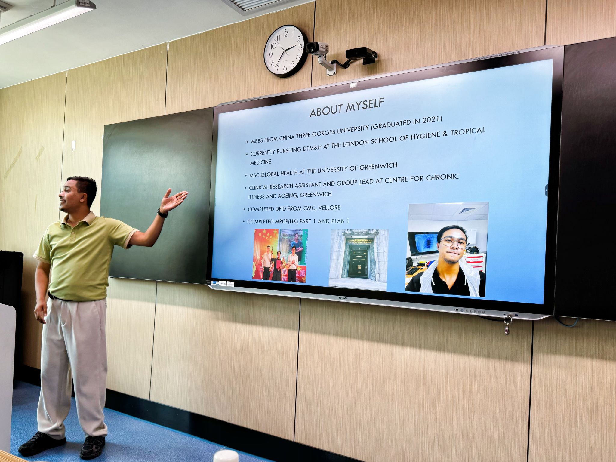 分享会上,李天以一张三峡大学图书馆的照片开场,笑着回忆道:“如果有人问我在哪里,答案总是图书馆的二楼咖啡吧——那是我最爱的学习角落。”他坦言,自己坚信“坚持胜过强度”,通过按月制定详细计划、提前完成课程复习、结合教材与前沿期刊学习,最终以优异成绩毕业。他还强调,在校期间担任国际学生协会副主席、参与各类医学志愿者活动、文娱活动及学科竞赛,让他的校园生活“既充实又多彩”。李天向学弟学妹们了展示了他在校期间获得的各项荣誉,包括中国政府优秀留学生奖学金、三峡大学优秀留学生奖学金、三峡大学十佳优秀青年等。