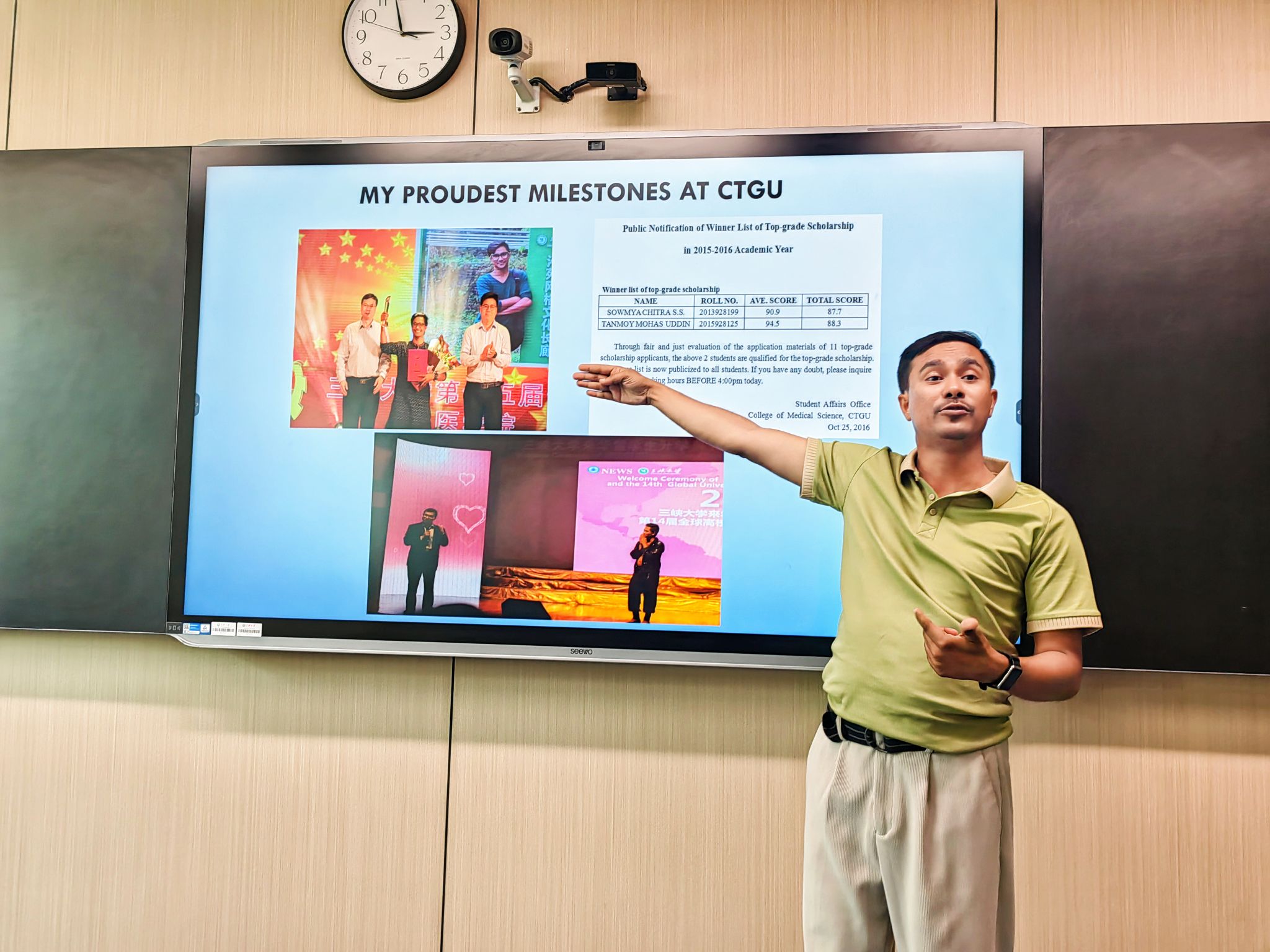 (通讯员 邹黎黎 刘柯 图 高红)近日,三峡大学基础医学院2015级本科临床医学专业来华留学生李天(Mohas Uddin Tanmoy)从英国专程返回母校,身穿学士服与昔日恩师共同补拍毕业照,弥补了因疫情未能线下毕业的遗憾。更令师生动容的是,他作为优秀校友代表,为70余名本科临床医学专业的在校留学生带来了一场关于学习规划、考研申请及职业发展的经验分享会,现场互动热烈,掌声不断。